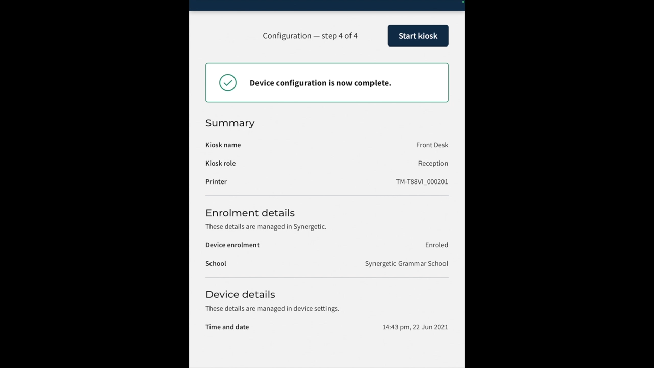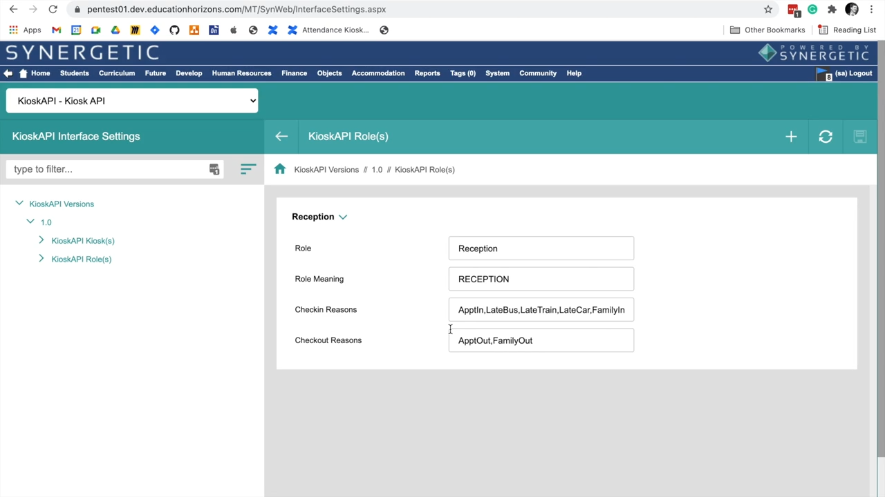 The kiosk role is the mechanism to configure the kiosk to meet the school's needs. Each kiosk is assigned a role that defines the functionality of the kiosk and the absence events it will record in synergetic.