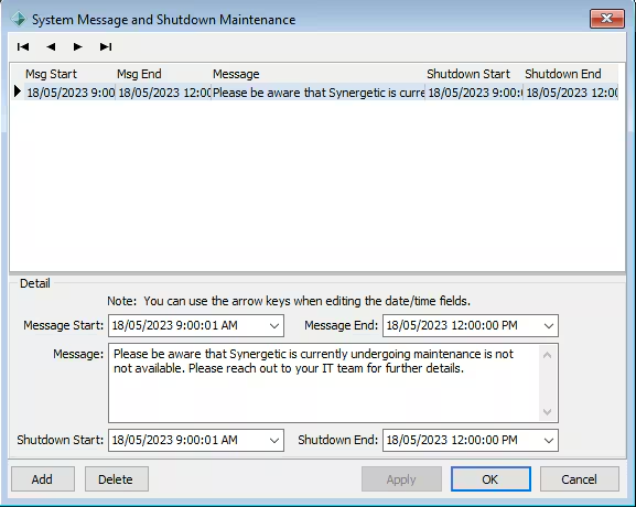 Click 'Add' and set up the start and end dates and times that you would like the message to appear. For planned maintenance, it may be an idea to have the message appear starting the day before in order to give staff advance notice. The message end date and time should be when the maintenance is expected to be completed by.